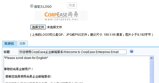 部分功能上全新尚易企业邮箱还提供了企业自主定制操作,例如,邮件信角定制,企业邮箱管理员可根据公司形象统一定制邮件信角,邮件信角定制后,所有员工发送出的邮件模版中,将均带有该定制的信角内容。而企业欢迎信定制,企业管理员可进行统一的定制,也可根据不同员工、不同部门等进行不同的欢迎信定制,在统一中追求创新。